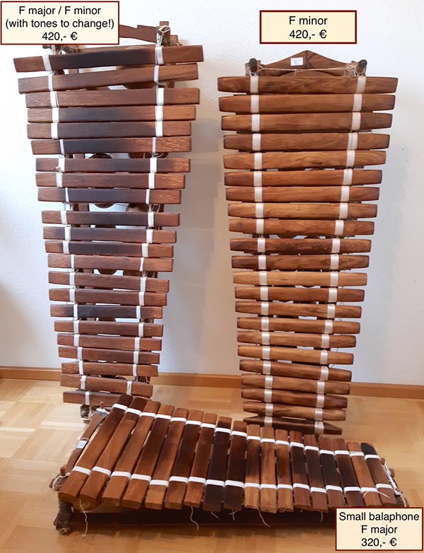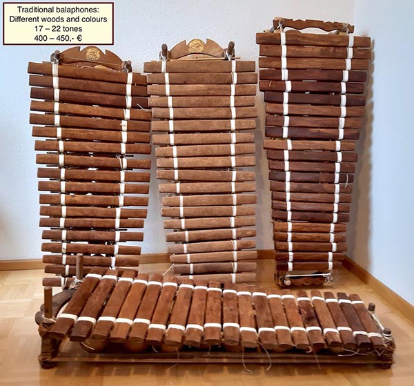 Balafone (7 Töne pro Oktave) aus Niagassola/Guinea, wo sich das UNESCO-geschützte Ur-Balafon von 1205 befindet. Nach dem Ur-Balafon gestimmte Instrumente (17 - 20 Platten) 380,- bis 400,- €. F-Dur oder C-Dur-Balafone (21 Platten) 450,- €.